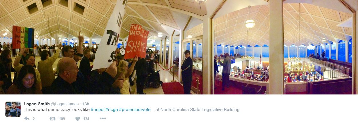 To Bouie's point ("if unchallenged"), as I wrote yesterday, massive resistance is about the only play North Carolina progressives have left. Democrats don't have the votes. Next year they won't have the U.S. Supreme Court or the Department of Justice either. If Republicans get their way, they will dominate state and county Boards of Elections as well. But the Moral Monday/Forward Together fusion movement the NC-NAACP led successfully to defeat McCrory is not going anywhere. They were there last night being arrested again for civil disobedience: