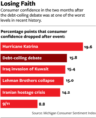 Moreover, he says, “the collapse of confidence in government has substantially eroded already weak consumer confidence. Today’s consumer-confidence rating is the fourth lowest since 1952. Make no mistake: This collapse of economic confidence is not an independent event driven only by economic reality. This sharp a drop in consumer confidence is a direct consequence of the lack of confidence in our political system and its leaders.”