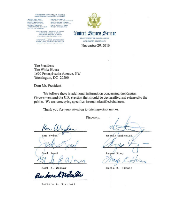 That's all the Democrats on the Senate Intelligence Committee except Dianne Feinstein. She stuck with the Republicans.